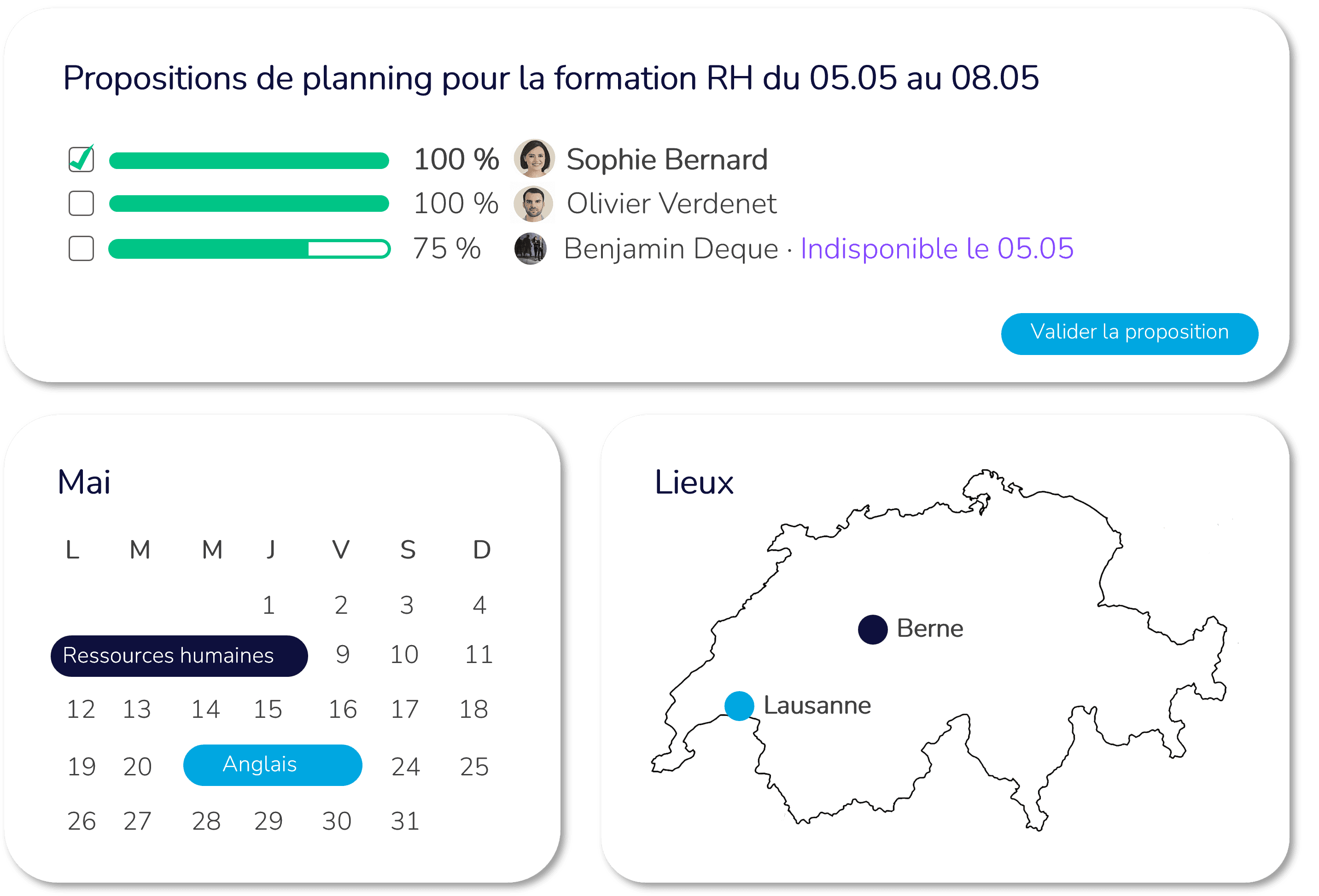 Les réservations de salles de formation (contraintes géographiques, capacités et disponibilités…)